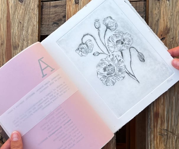 "Flores de mi alma" es un libro de artista que consta de 20 estampaciones calcográficas, cada una representando una letra del abecedario.